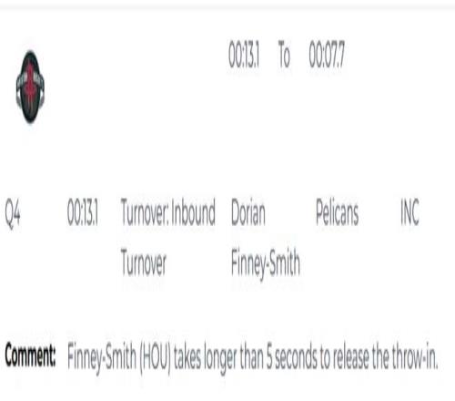 唯一的漏判发生在第四节最后13秒,芬尼-史密斯发边线球5秒违例,但裁判没有吹罚。这个球发出后,杜兰特完成了制胜一击,中距离跳投命中。考虑到杜兰特进球前火箭是落后的一方,裁判若吹了5秒违例,鹈鹕将获得球权,并有1分领先优势,他们显然是更有可能拿下胜利。显然,火箭占了一个大便宜。